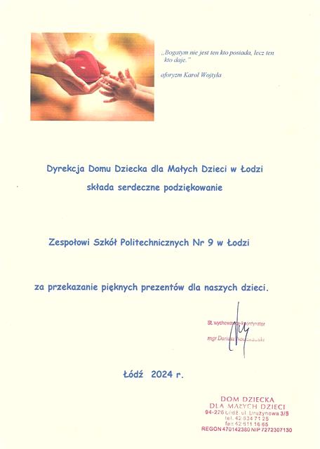 Dla dzieci z domu dziecka Posted on 24 kwietnia 202424 kwietnia 2024 By Jadwiga Jezierna Nasza szkoła otrzymała podziękowania od Domu Dziecka dla Małych Dzieci w Łodzi za zbiórkę darów przeprowadzoną przez Zespół wolontariatu szkolnego. wydarzenia, x