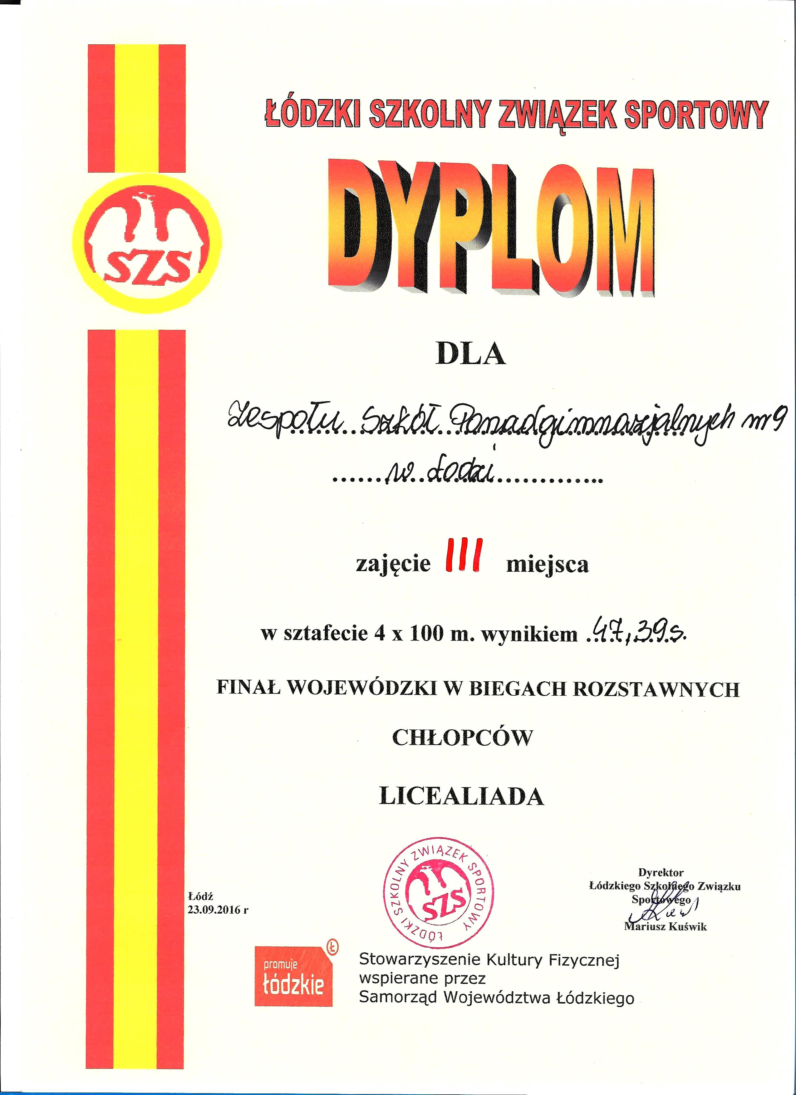 W dniu 23 września 2016 roku na stadionie AZS w Łodzi odbył się Finał Wojewódzki w Biegach Rozstawnych tj. w sztafecie 4×100 metrów oraz w sztafecie szwedzkiej 100 x 200 x 300 x 400 metrów. W sztafecie 4 x 100 metrów drużyna w składzie: Michał Rutkowski (kl. III TE), Damian Nowakowski (kl. II TD), Patryk Teskowski (kl. II TE) i Dominik Kurela (kl. I TA) zajęła III miejsce.