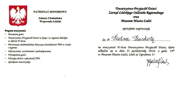 Okazją do wręczenia odznaczeń, nagród i podziękowań działaczom, darczyńcom, współpracownikom i przyjaciołom Towarzystwa Przyjaciół Dzieci była 95 rocznica powstania organizacji. Oddział łódzki Towarzystwa Przyjaciół Dzieci świętował jubileusz 23 października w Pałacu Poznańskich.