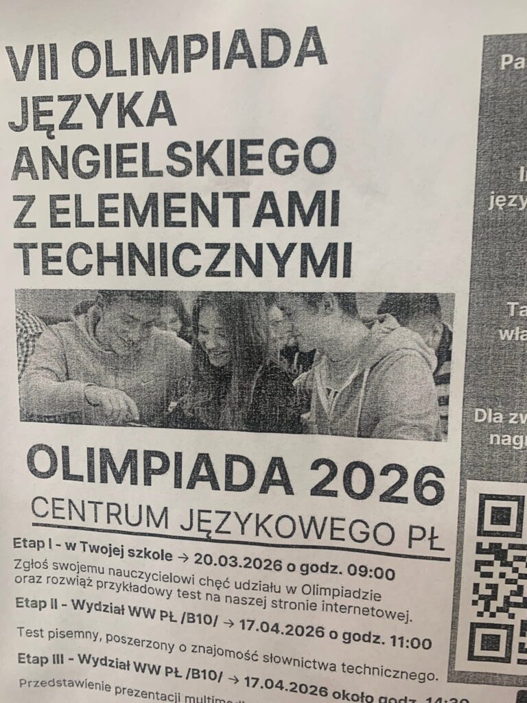 Pierwszy etap 7. Olimpiady Języka Angielskiego z Elementami Technicznymi „Od nitki do słówka”, poświęconej słownictwu z zakresu przemysłu włókienniczego, modowego i tekstylnego, odbył się 20 marca o godzinie 9:00 w naszej szkole.