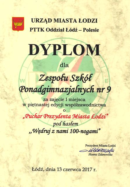 W XV edycji współzawodnictwa o Puchar Prezydenta Miasta Łodzi pod hasłem „Wędruj z nami 100-nogami” laury zwycięstwa w kategorii szkół ponadgimnazjalnych przypadły Zespołowi Szkół Ponadgimnazjalnych nr 9.