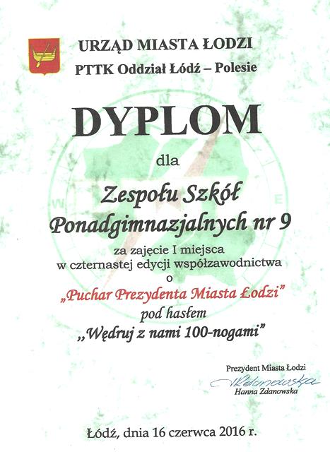 W XIV edycji współzawodnictwa o Puchar Prezydenta Miasta Łodzi pod hasłem „Wędruj z nami 100-nogami” w pionie szkół ponadgimnazjalnych nasza szkoła po raz dwunasty zajęła PIERWSZE MIEJSCE. Szkoła otrzymała dyplom i puchar za I miejsce a nauczyciel Jan Ślewa otrzymał pamiątkowy dyplom od Zarządu Głównego PTTK za zasługi w upowszechnianiu turystyki i krajoznawstwa.