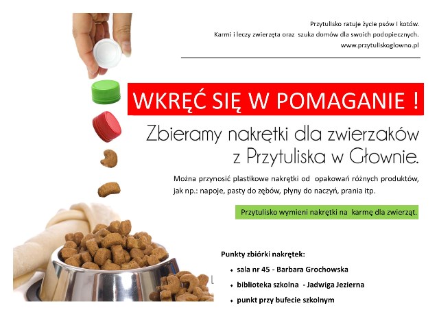 Koło Ekologiczno-Chemiczne i biblioteka szkolna zapraszają do zbierania nakrętek na rzecz psów i kotów ze schroniska dla zwierząt.