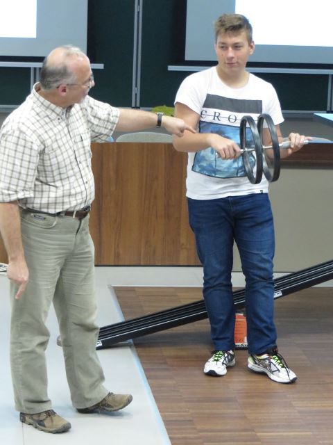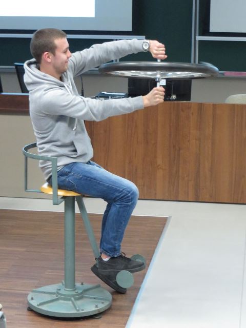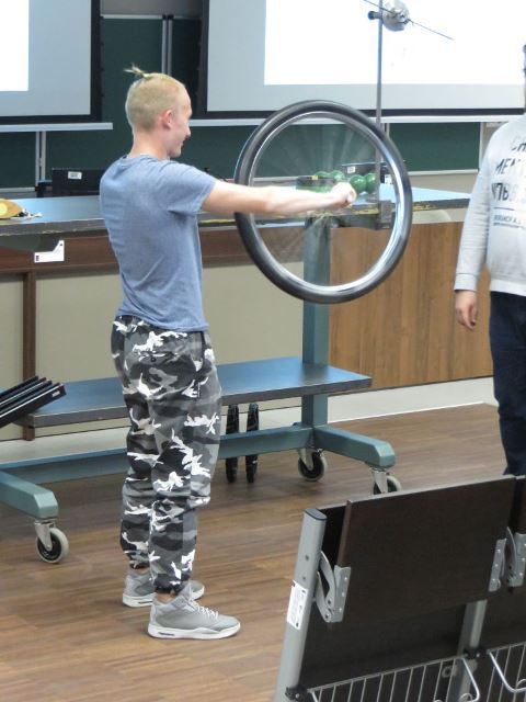 Wykład ilustrowały liczne doświadczenia. Zaprezentowano: toczenie się bryły sztywnej o symetrii walcowej, staczanie się różnych brył sztywnych o symetrii walcowej po równi pochyłej – analiza wyników eksperymentów, sprawdzanie zasady zachowania momentu pędu w układzie stołek obrotowy-siedzący-koło rowerowe o zwiększonym momencie bezwładności oraz stołek rowerowy-siedzący-hantle (kule), precesję bryły sztywnej o symetrii walcowej, podnoszenie się środka ciężkości bryły sztywnej w celu obrotu wokół osi o największym momencie bezwładności, zjawisko giroskopowe na przykładzie wirowania koła rowerowego lub wirnika odkurzacza) oraz omówiona została zasada jazdy na rowerze.
